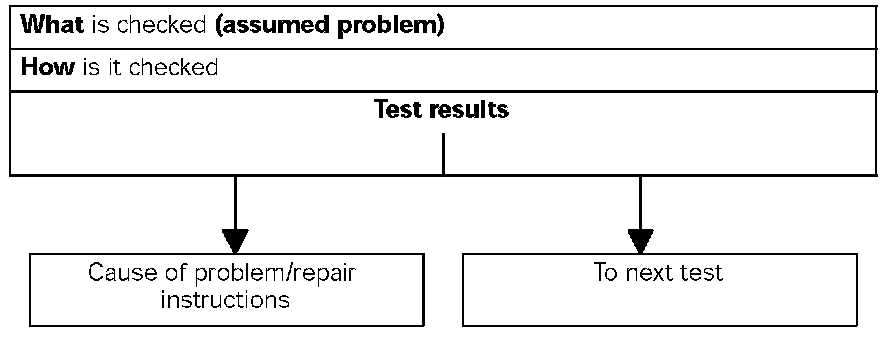 Starting with the reported problem, troubleshooting procedures show step-by-step what is checked and how it is checked in order to find the problem in the quickest and most reliable way. If several causes (of a problem) are possible in one system, a test procedure is used for diagnosis.