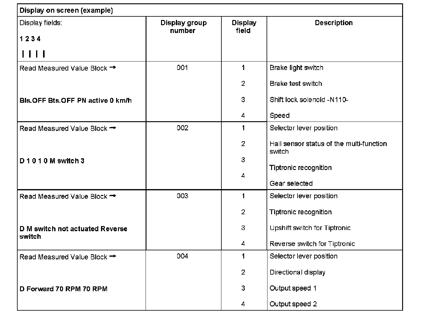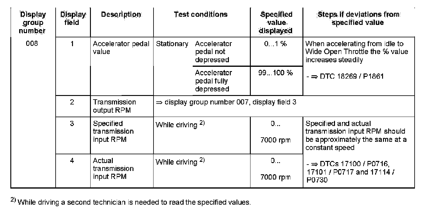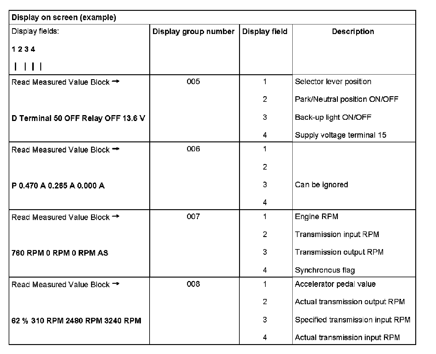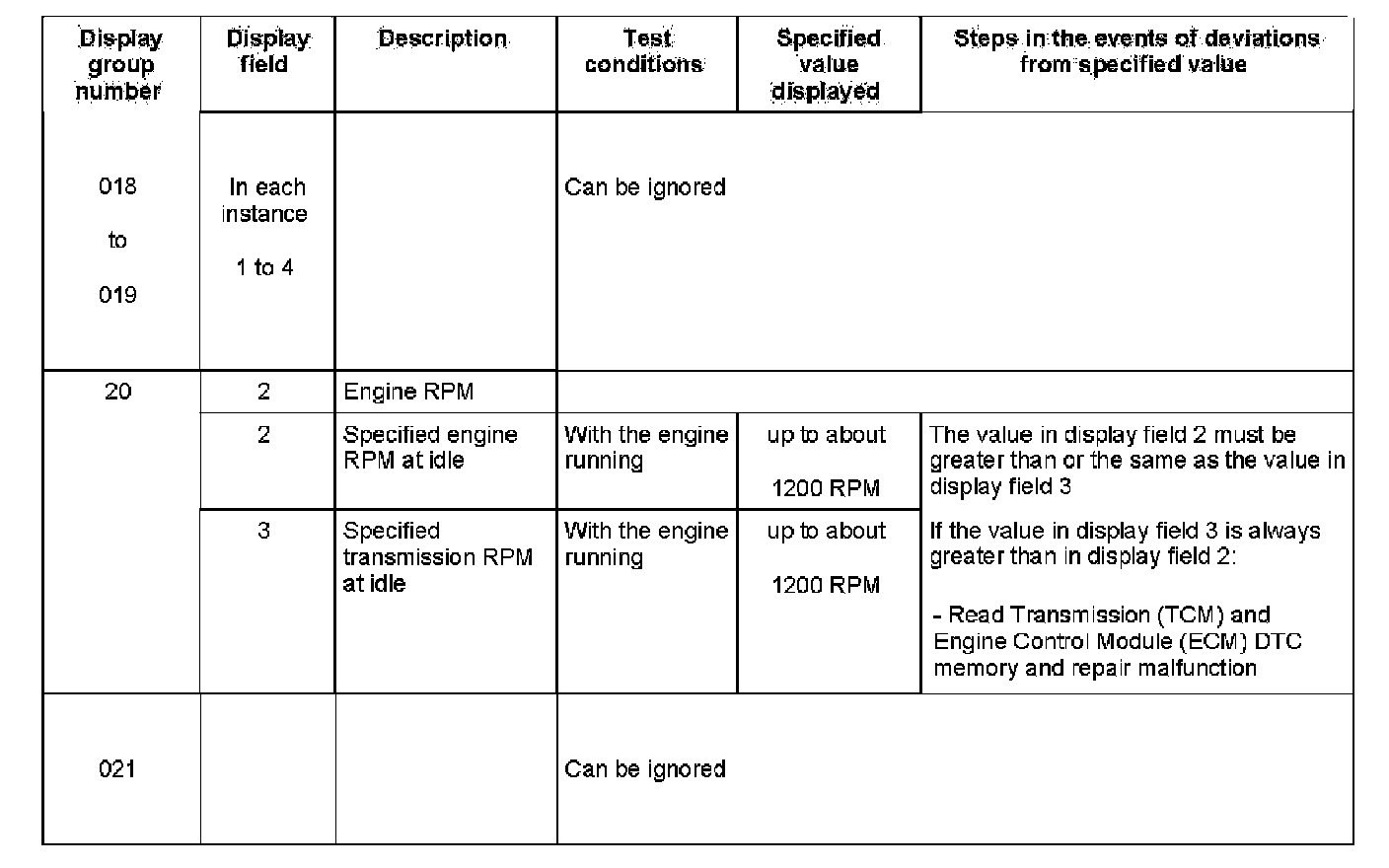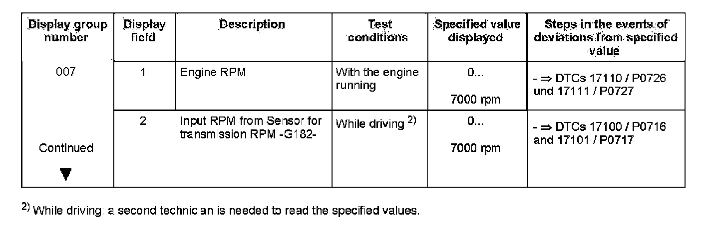 ^ If "0 RPM" is shown in display field 3 or 4, the corresponding sender is faulty and the Transmission Control Module (TCM) must be replaced.