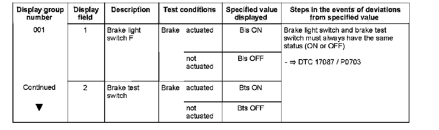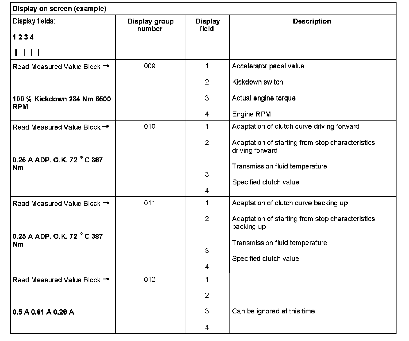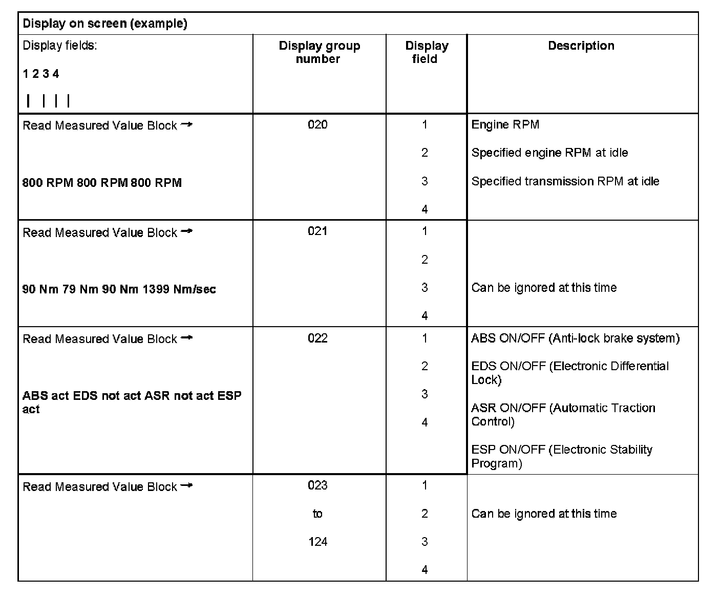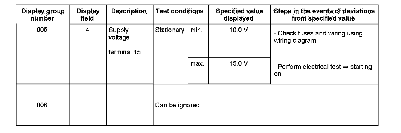 Note: The legend for the values in the individual display fields can be found under- "Test Chart for Measured Value Blocks".