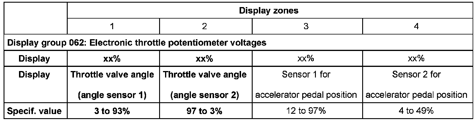 - The reason why the value in display zone 1 rises and that in zone 2 falls is that the potentiometers (angle sensors) in the throttle valve control module operate in opposite directions.