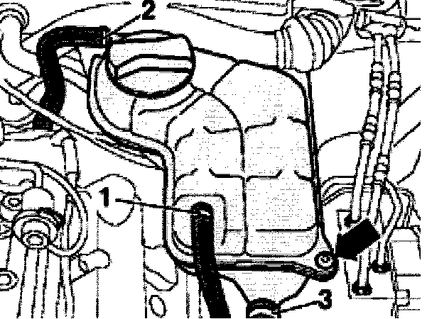 - Tie coolant expansion tank with connected coolant hoses -1 to 3- to side.