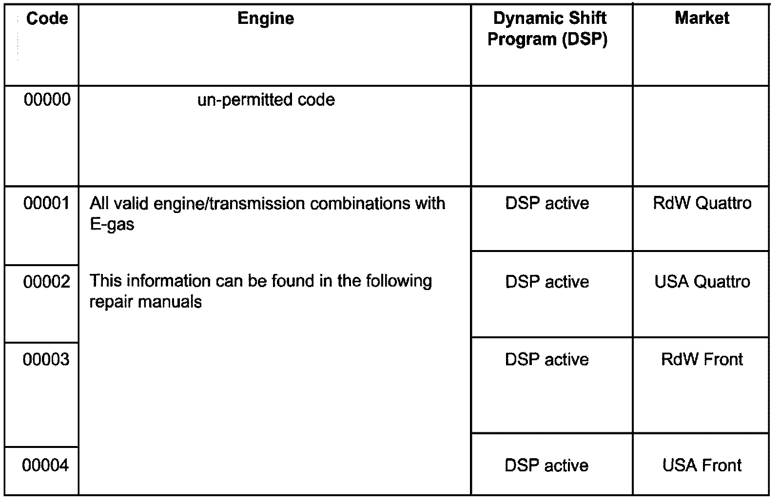 Note: Read Transmission Control Module (TCM) identification to determine which transmission/engine combination is present in this particular case, see clarification above. Then use coding table to determine whether the appropriate code is entered.