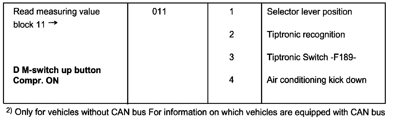 2) Only for vehicles with CAN bus For information on which vehicles are equipped with CAN bus Refer to Transmission and Drivetrain; Automatic Transmission/Transaxle; Application and ID.