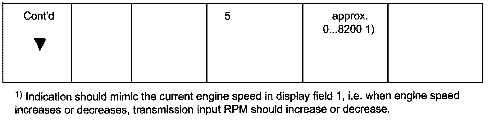 1) Indication should mimic the current engine speed in display field 1. i.e. when engine speed increases or decreases, transmission input RPM should increase or decrease.