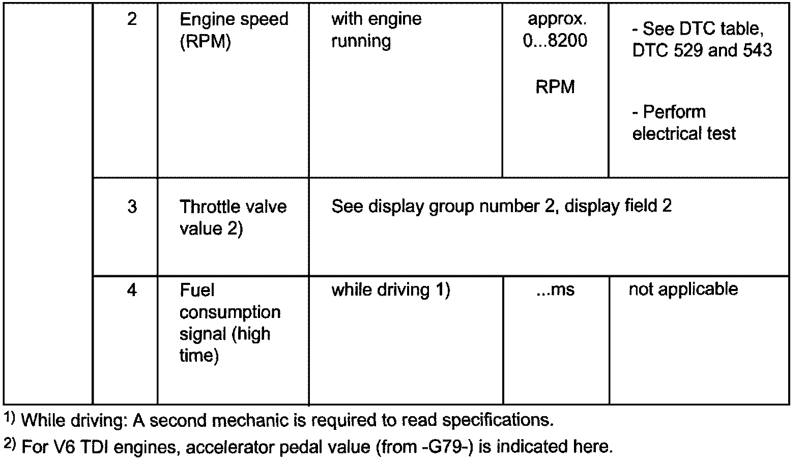 2) For V6 TDI engines, accelerator pedal value (from -G79-) is indicated here.