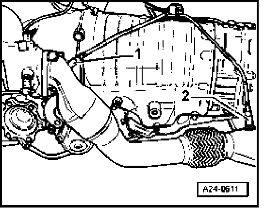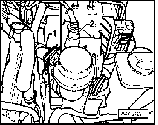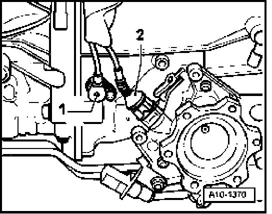 Fig. 6 Installed location of Engine speed (RPM) sensor -G28-, item -1- and vehicle speed sensor, item -2-