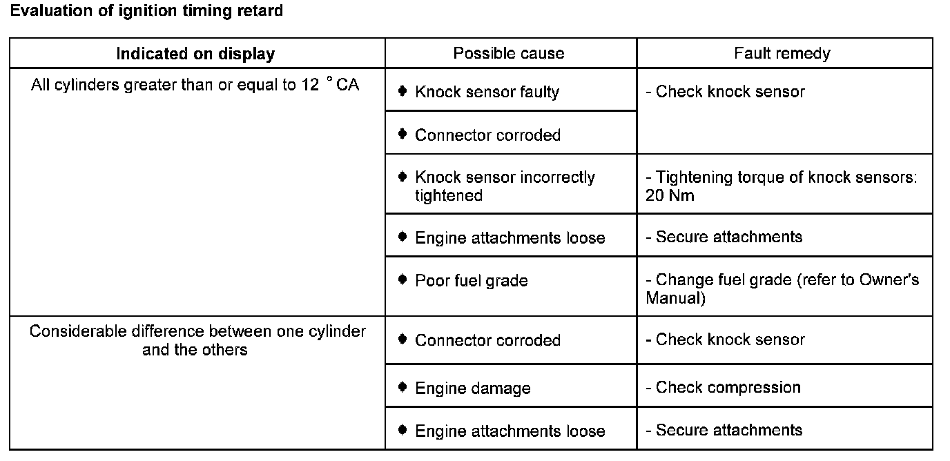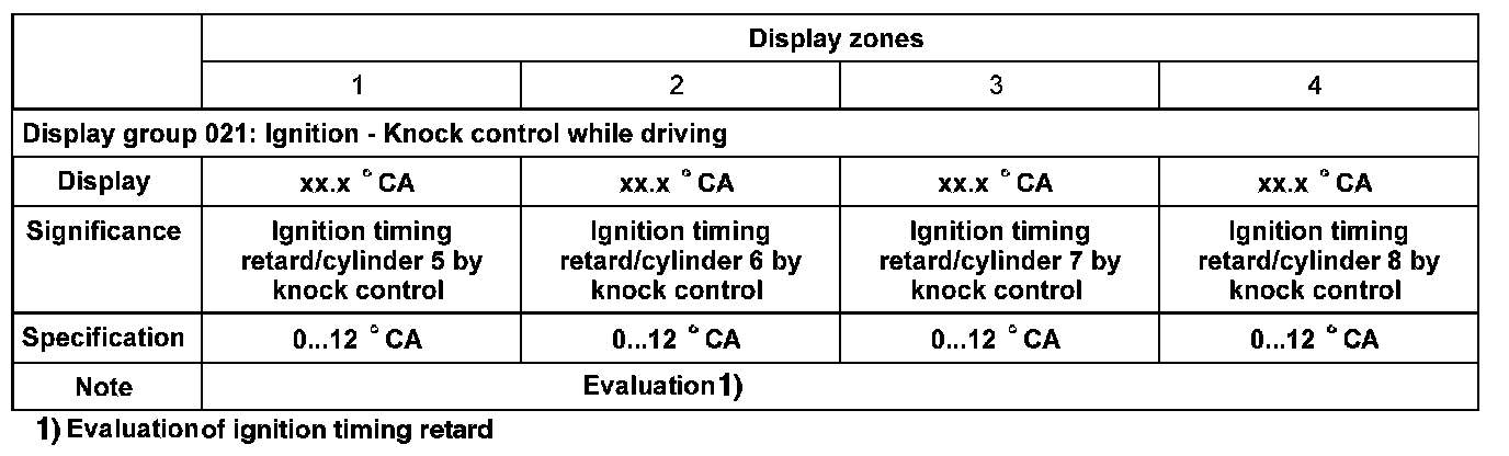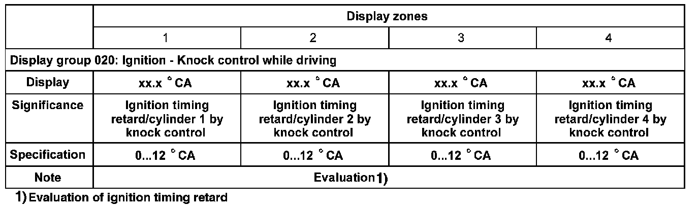 NOTE: The numerical values displayed in zones 1 to 4 represent the actual ignition timing retard by the knock control for the individual cylinders. The ignition timing is retarded in CA (degrees crank angle).