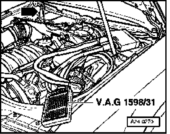 - Connect test box V.A.G 1598/31 to wiring harness connector. Ground clip (arrow) must be connected to Ground. Whether or not engine control module is additionally connected to test box is indicated in appropriate test sequences.