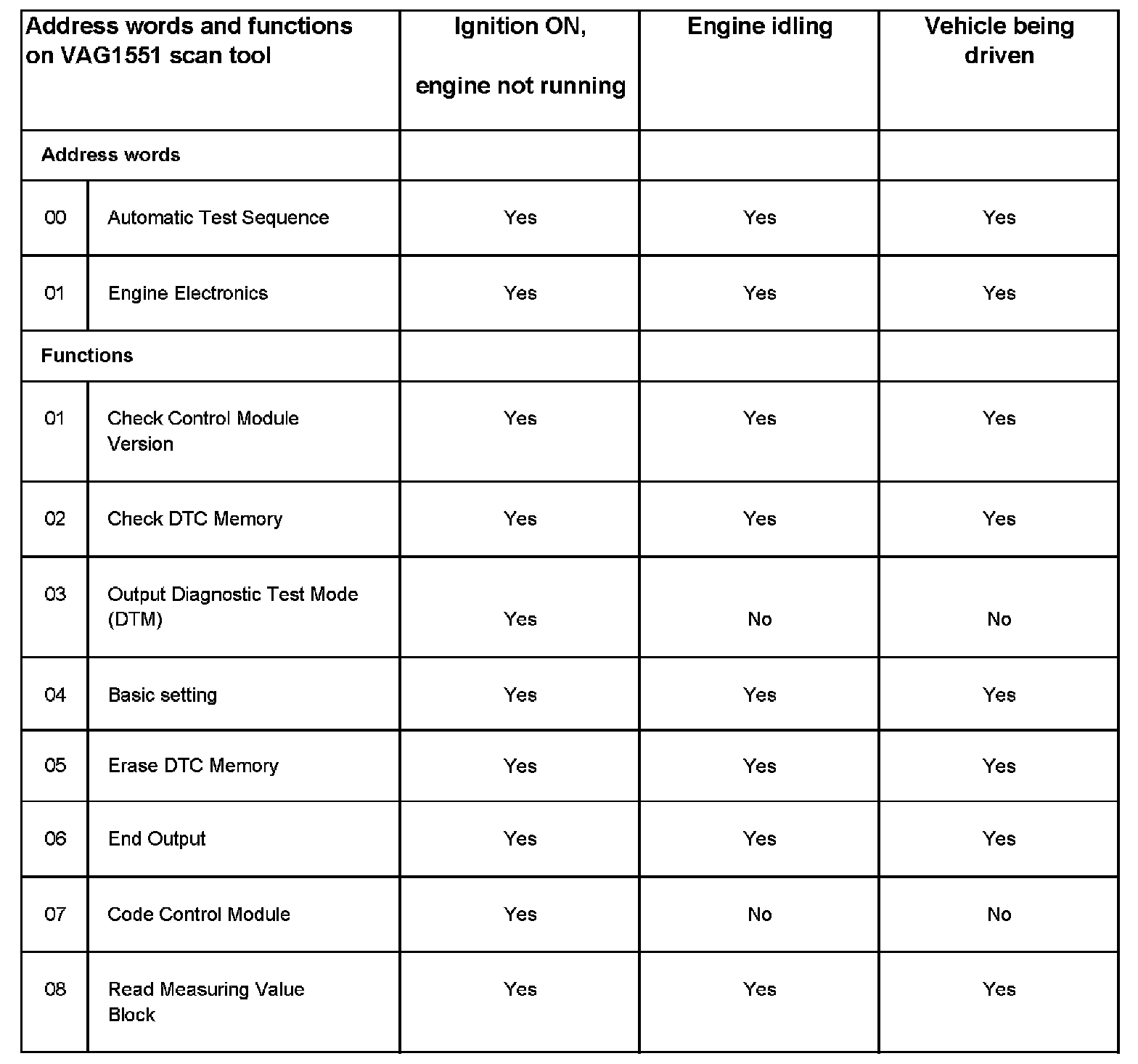 Address Word and Functions On VAG1551 Scan Tool