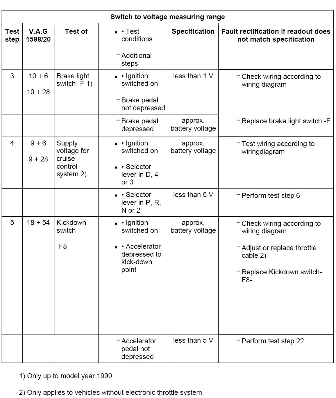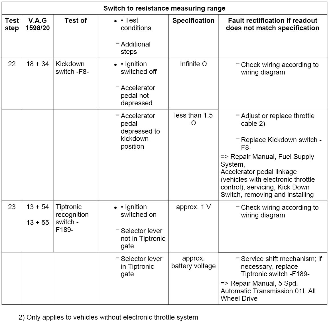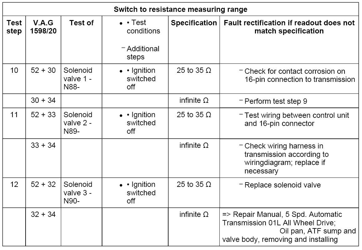 5 Speed Automatic Transmission 01L All Wheel Drive On Board Diagnostic (OBD)Test TableTest Steps 1-2: