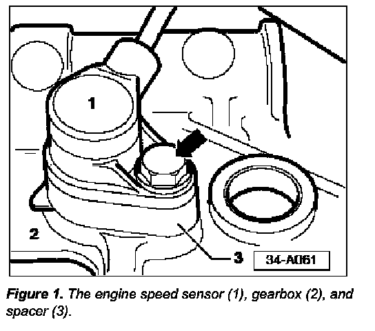 Condition may be caused by a spacer (Figure 1, 3) installed between the engine speed (RPM) sensor (G28) (Figure 1, 1) and the gearbox (Figure 1, 2).