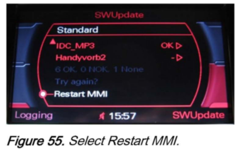 2. Wait 30-60 seconds until the MMI system recognizes the CD. Then access the red update menu (press and hold the SETUP and RETURN buttons) and select the function SW Update with the lower right soft button.