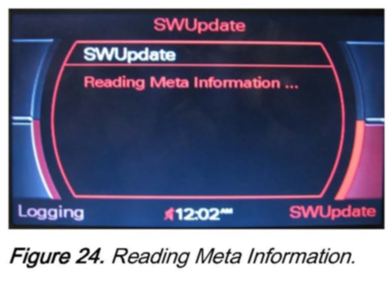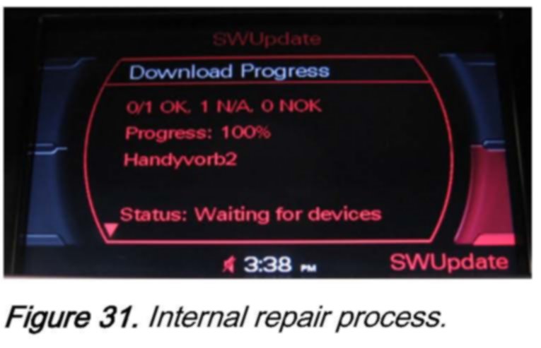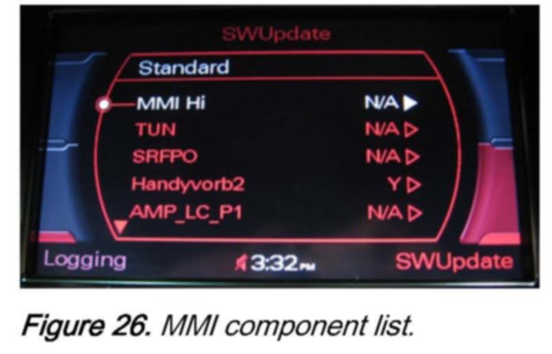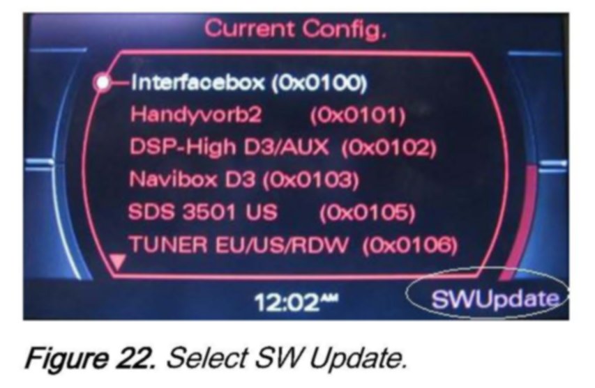 2. Wait 30-60 seconds until the MMI system recognizes the CD. Then access the red update menu (press and hold SETUP and RETURN buttons) and select the function SW Update with the lower right soft button.