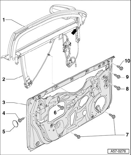 - Remove bolts - 6 - and - 9 - and lift window frame with window regulator upward and out of door.