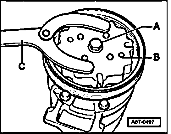 - When slackening off and tightening bolt -A-, provide support with a commercially available pin wrench -C- (pin diameter 5.0 mm) at drive plate -B-.