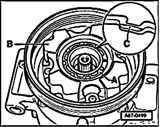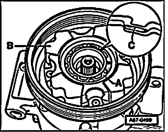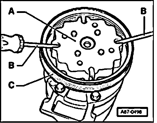 - When prising off drive plate -A-, take care not to damage collar of pulley -C-.