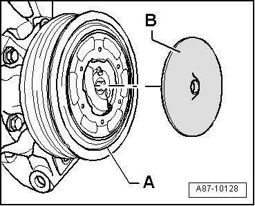 - Clean drive plate of belt pulley - A - and glue plastic disc - B - centered onto drive plate only on compressors without rubber ring on circlip.