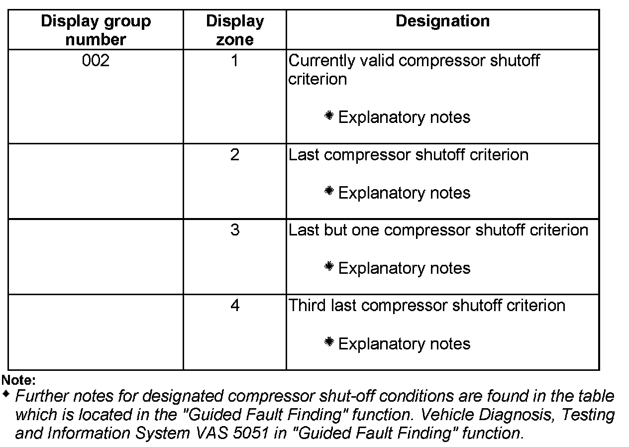 Explanatory notes for compressor shut-off conditions in display group "002"