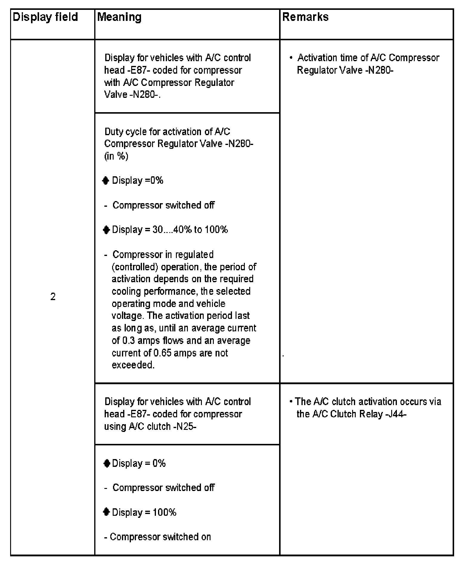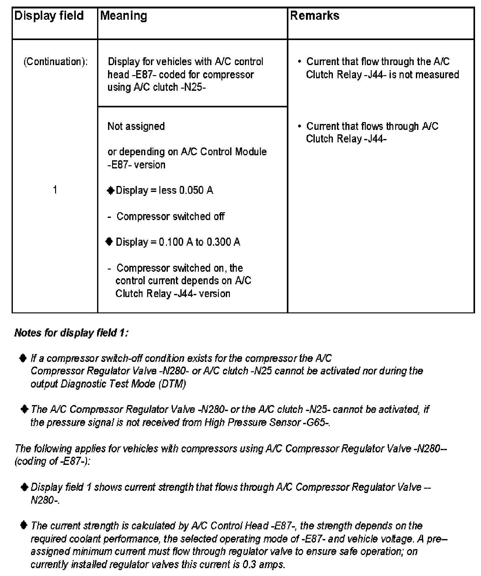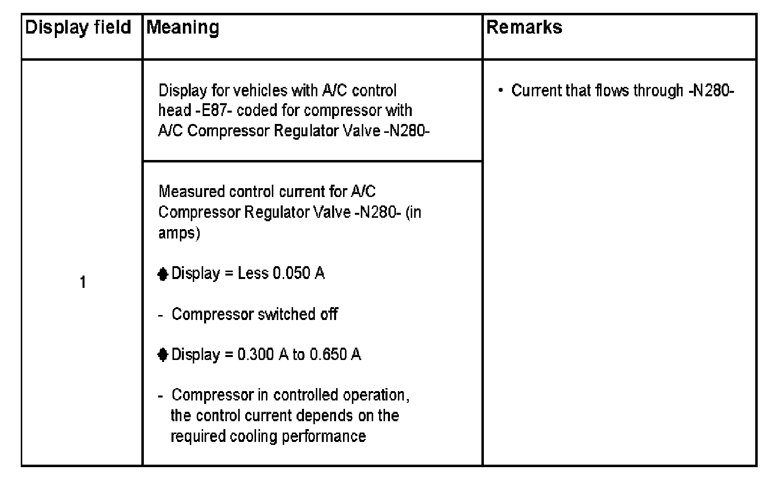 - If the A/C Control Head -E87- is coded with an A/C Compressor Regulator Valve -N280-, a current of approximately 200 milli amps is displayed (current that flows through coil of A/C Clutch Relay -J44-). The compressor cannot be regulated.