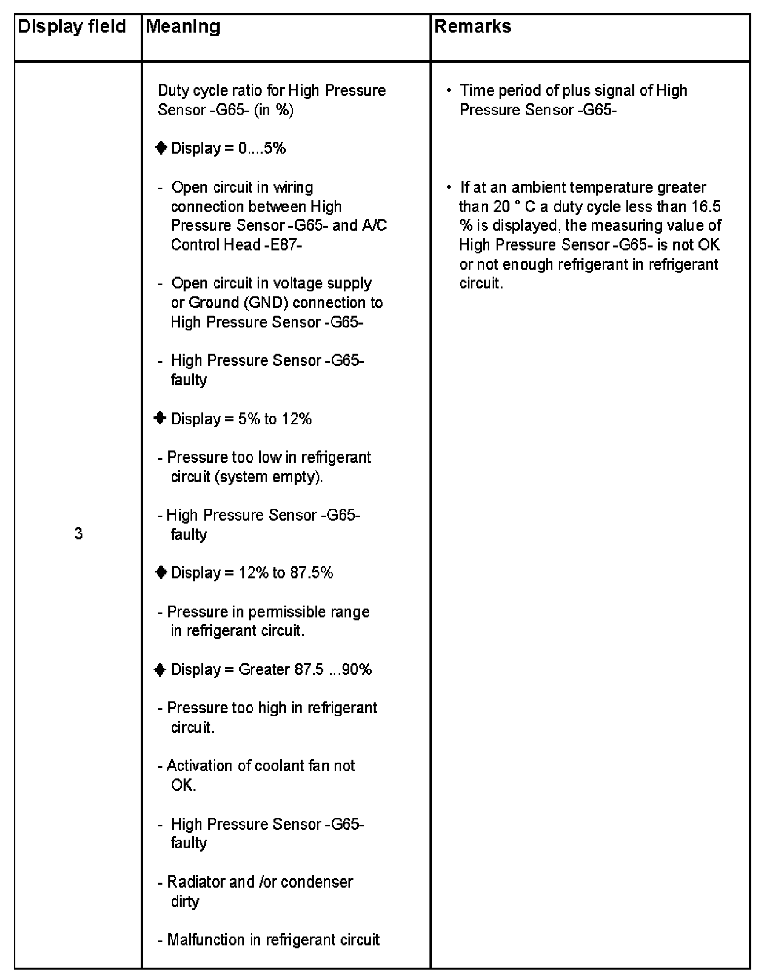 - The signal generated by the High Pressure Sensor -G65- is also used to control the engine (the torque that is necessary to drive the compressor depends on the pressure in refrigerant circuit).