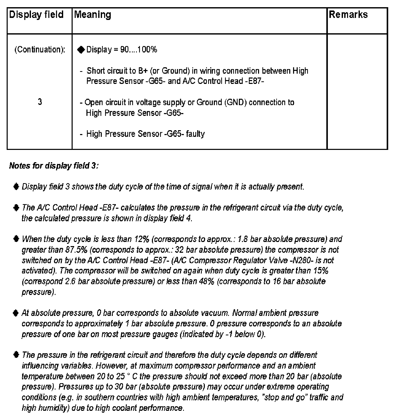 - The signal that is transferred when the pressure in the refrigerant circuit is approximately 5 to 6 bar, corresponds to an approximate duty cycle of 22% (with compressor not engaged, an ambient temperature of 20 °C and properly filled refrigerant circuit)