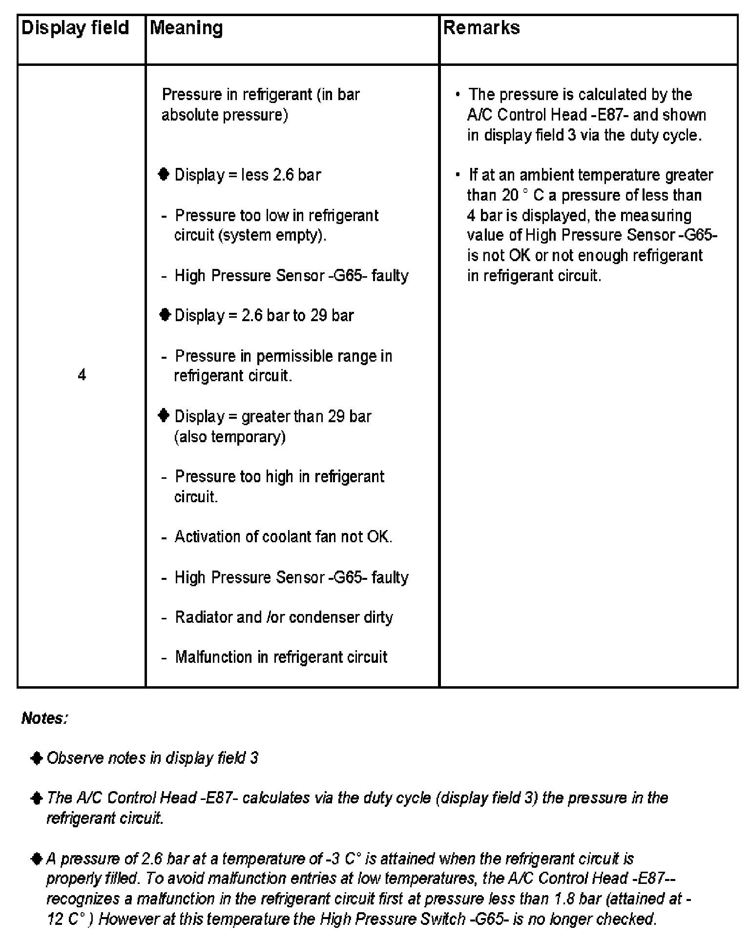 - The A/C Control Module -E87- switches the compressor off when the pressure in the refrigerant circuit exceeds 30 bar (absolute pressure), the compressor is switched on again after pressure drops below 16 bar.