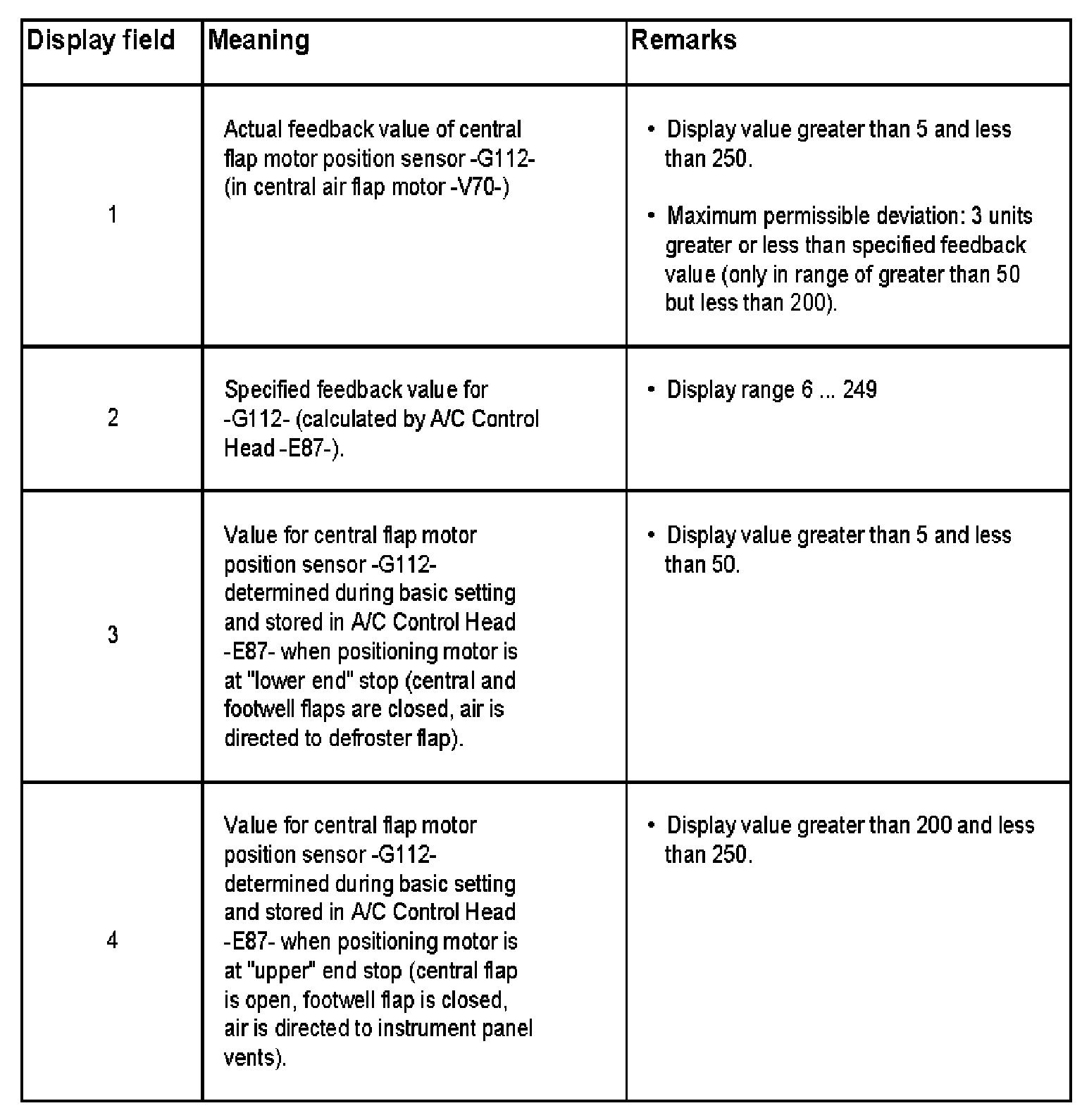 - Footwell open and central flap closed See Air in footwell (feedback value in display field 1 and 2 between 70 and 90). 2 between 70 and 100).
