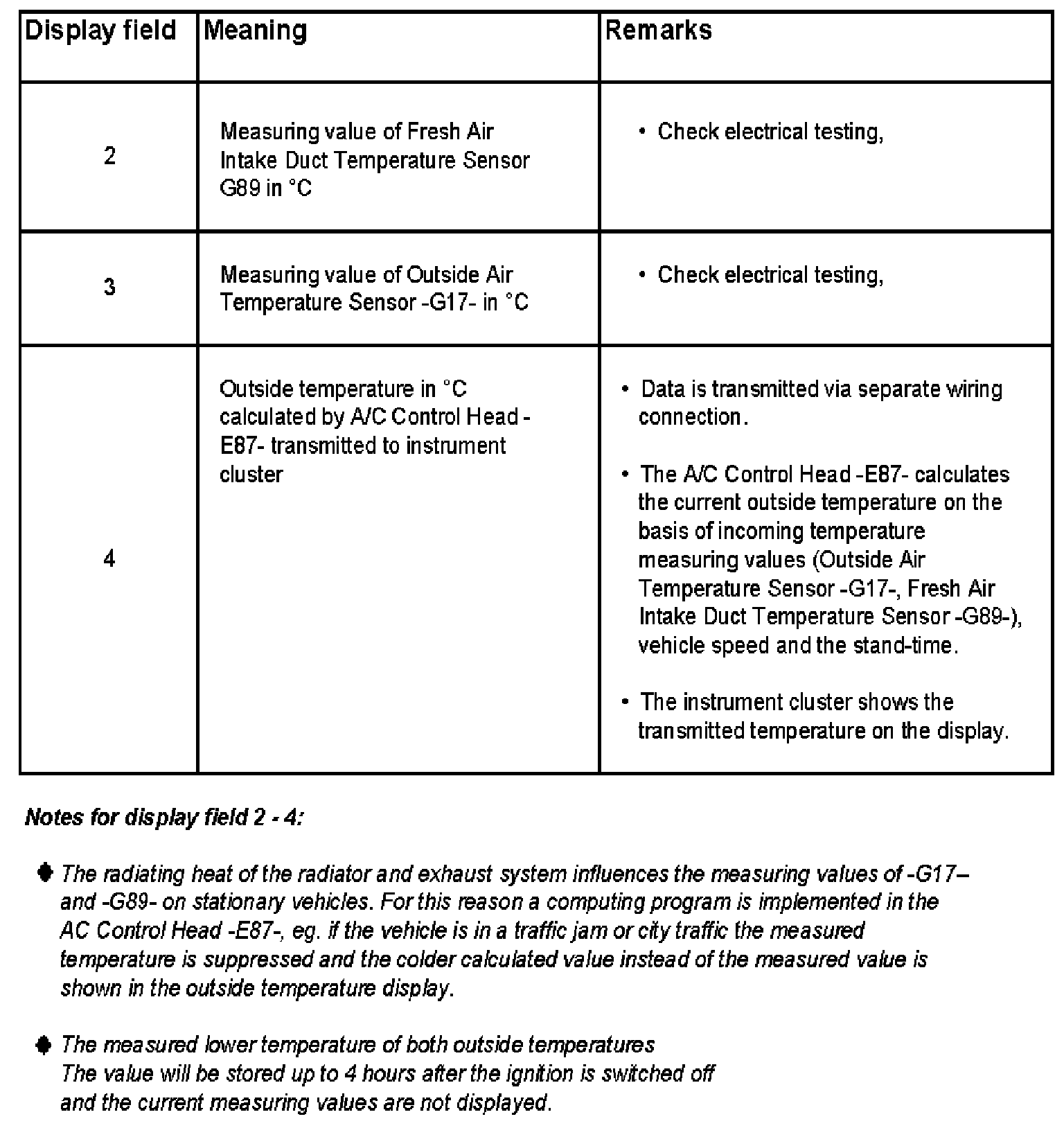Measuring values for Evaporator Vent Temperature Sensor -G263-, Fresh Air Intake Duct Temperature Sensor -G89-, Outside Air Temperature Sensor -G17- and calculated outside temperature transmitted to instrument cluster