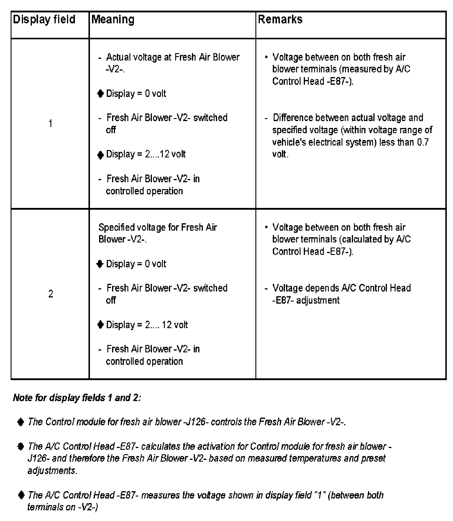 From instrument cluster transmitted voltage on terminal 58d and voltage on terminal 58s actual and specified voltage to activate the Fresh Air Blower -V2