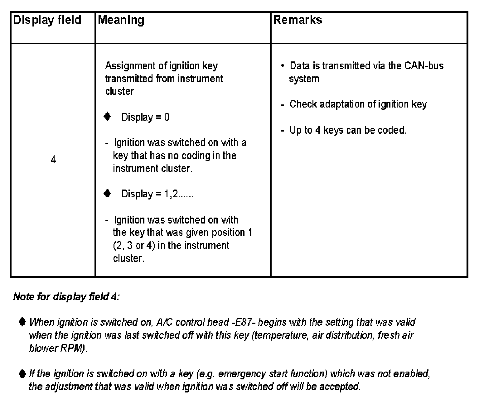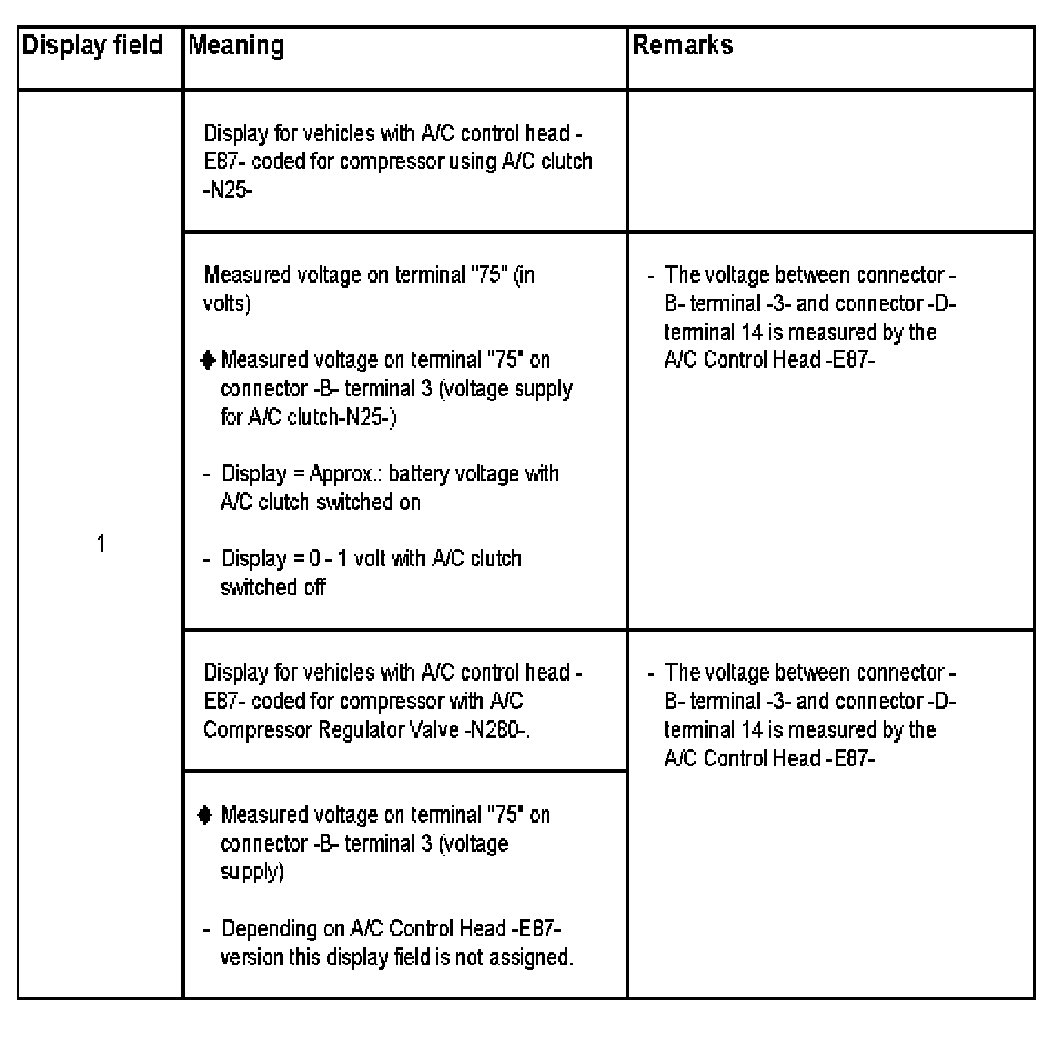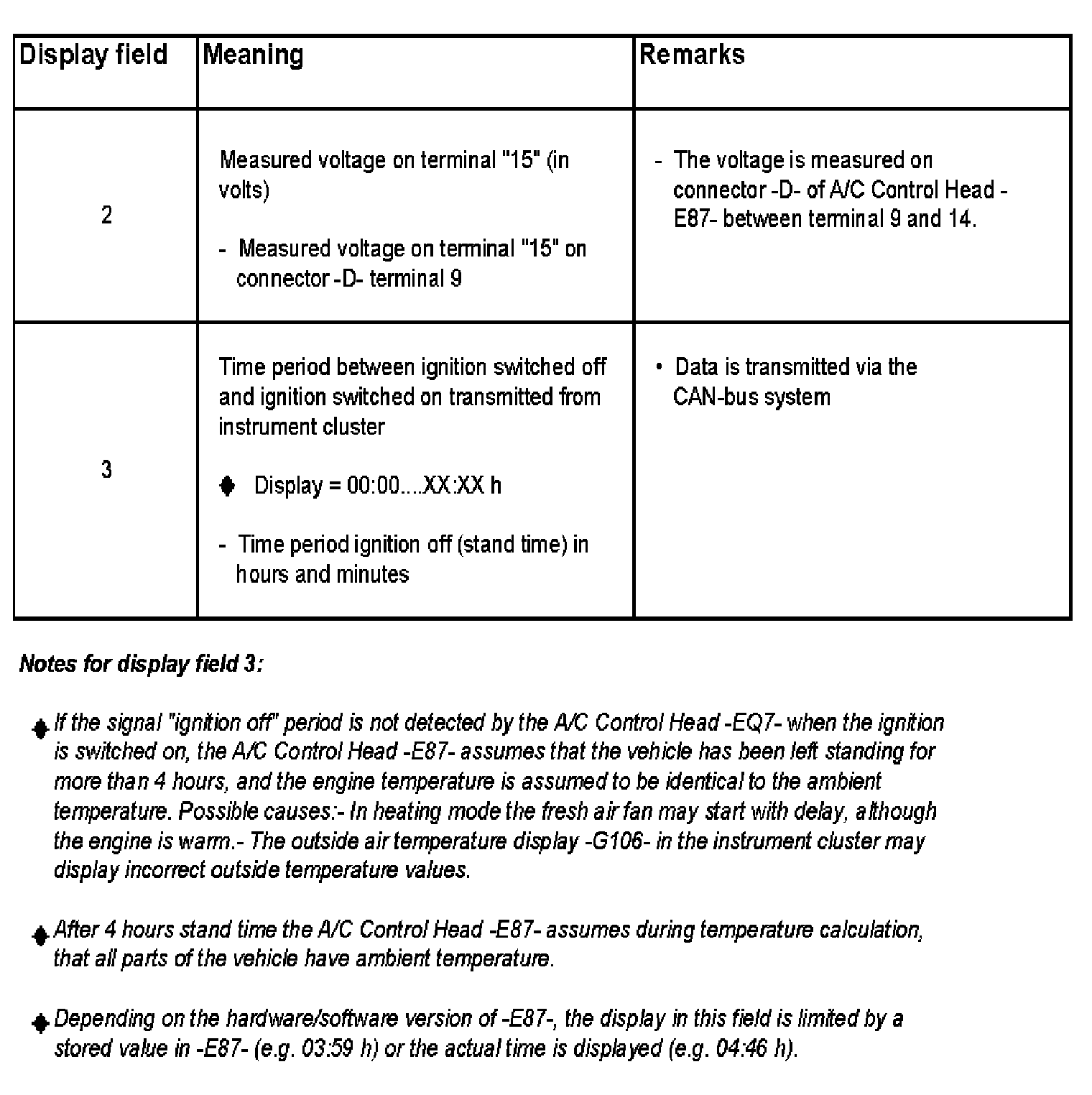 Measured voltage at terminal "75", terminal "15", time period "ignition off" transmitted from instrument cluster and transmitted ignition key assignment