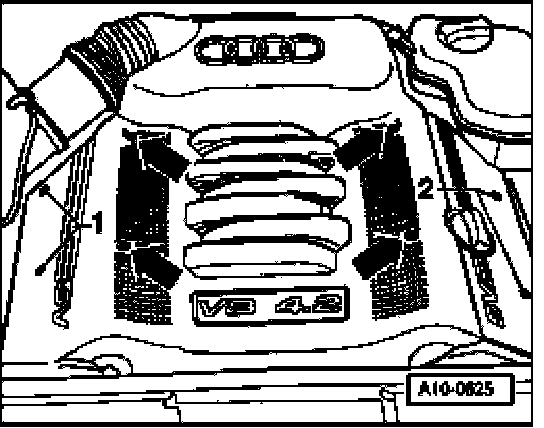 - Camshaft Position (CMP) Sensor -G163- is located at rear of left cylinder head (bank 2). To reach the harness connector, the line to Engine Coolant Level (ECL) Warning Switch at bottom on reservoir must be disconnected, bolts -arrows- of coolant reservoir must be unscrewed and set it aside. Coolant hoses-1- and -2- remain connected.