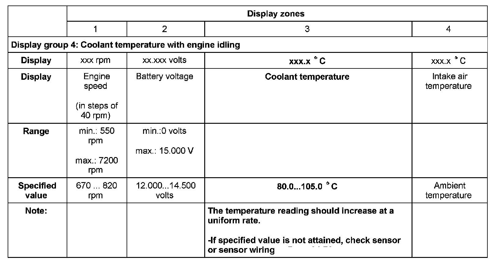 - Check specified value for engine coolant temperature sensor in display zone 3