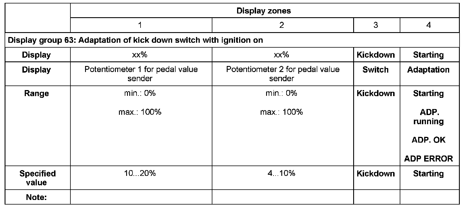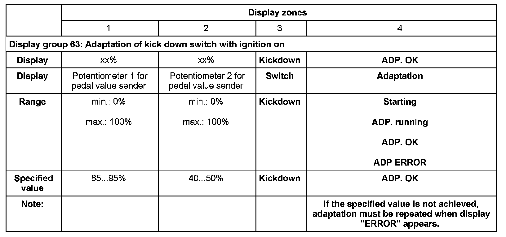 After replacing the engine control module and after replacement of the accelerator pedal, the kick down switch in vehicles with automatic transmission must be subjected to adaptation.