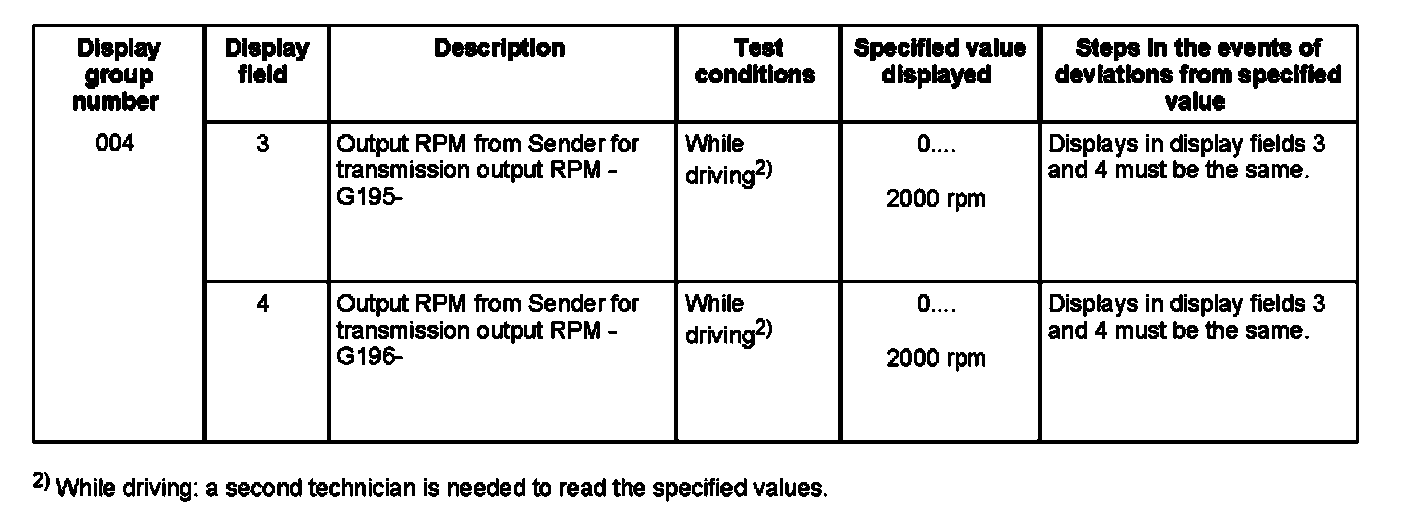 ^ If "0 RPM" is shown in display field 3 or 4, the corresponding sender is faulty and the Transmission Control Module (TCM) must be replaced.