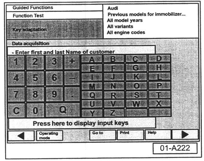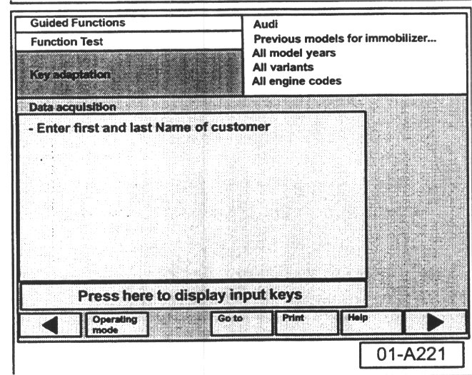 Only key 5051 display screens needed in the following procedure are illustrated here. Follow all text prompts as indicated on each VAS 5051 screen.