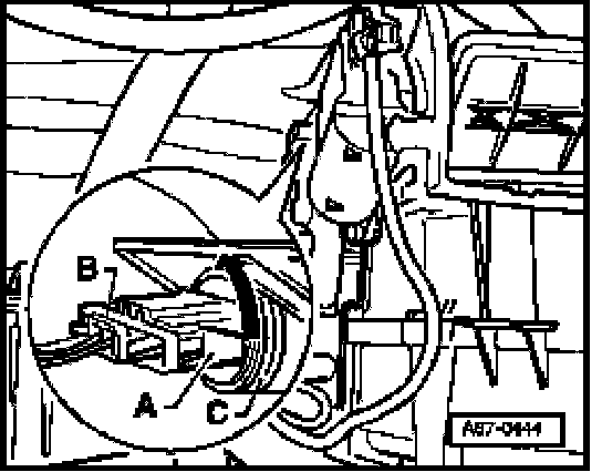 - Reach between air conditioner and bottom panel of plenum chamber, grasp hold of temperature sensor - A - and give it an approx. 90 degrees turn in direction of arrow.