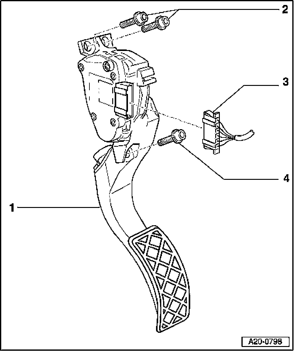 - In a vehicle with automatic transmission, the kickdown function must be adapted when accelerator pedal module is replaced: To do so, switch on ignition and press accelerator pedal all the way down past the kickdown point and hold in position for at least 20 seconds.