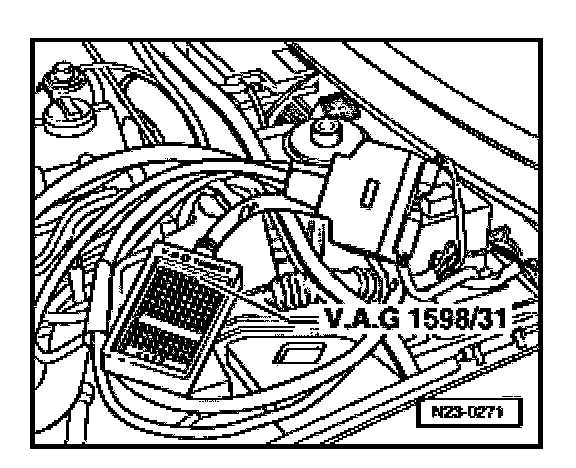 - Connect e.g. VAG1598/31 test box to connectors of wiring harness. Connect Ground (GND) clip of test box (not visible in illustration) to Ground (GND). Relevant test procedures note whether Engine Control Module (ECM) should also be connected to the test box.