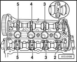 - First remove bearing caps 3 and 5 on intake and exhaust camshafts.