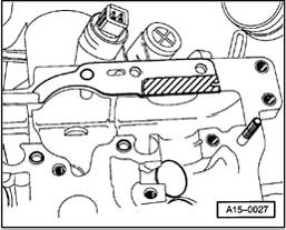 - Replace rubber/metal gasket for camshaft adjuster and apply a thin coat of sealant AMV 188 001 02 to shaded areas.