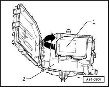 - Attach the (VAS 6223/9) - 1 - onto the MOST-Bus connector - 2 -.