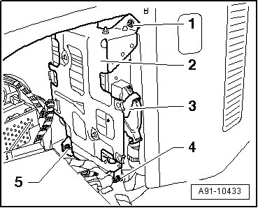 - Remove the nuts - 1 -, - 4 - and - 5 - (3 Nm) and remove bracket - 2 - with digital sound system control module 2 toward right.