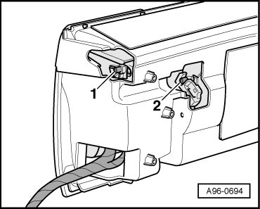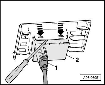 - Lift rear of switch - arrow 1 - and detach towards inside of storage compartment - arrow 2 -.