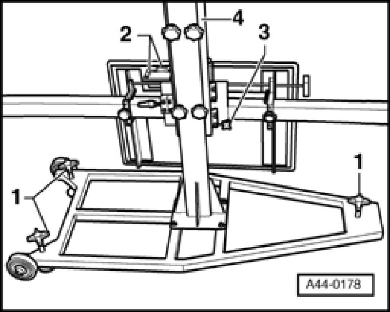 - Adjust the vertical carriage -4- of VAS 6190 so that laser beam meets center of coarse adjustment tool vertically.