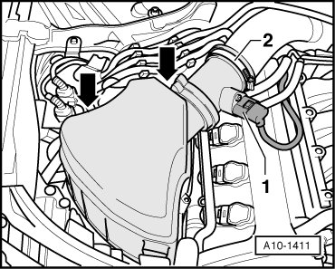 - Open hose clamp and carefully pull Mass Air Flow (MAF) Sensor (G70) out of guide from air filter housing.