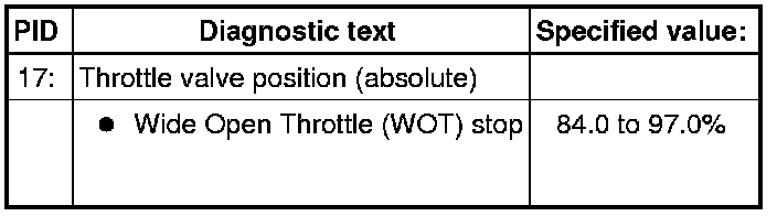 - Check specified value of throttle valve position (absolute) at Wide Open Throttle (WOT) stop:
