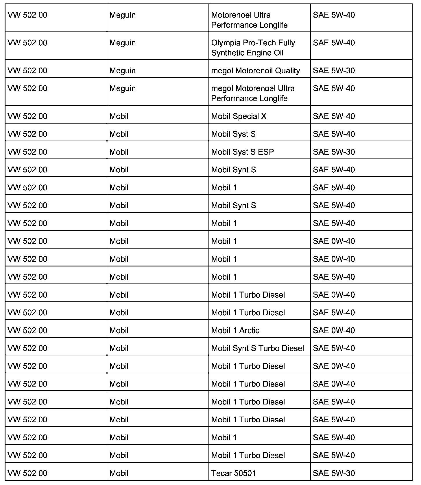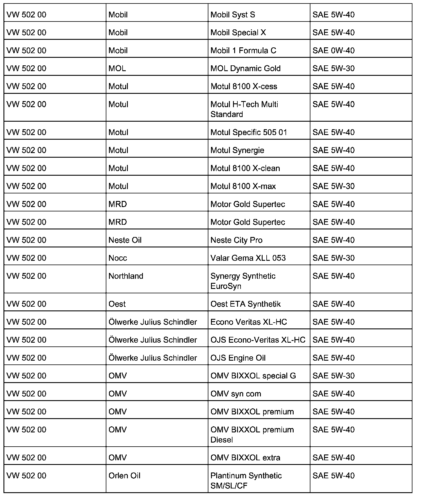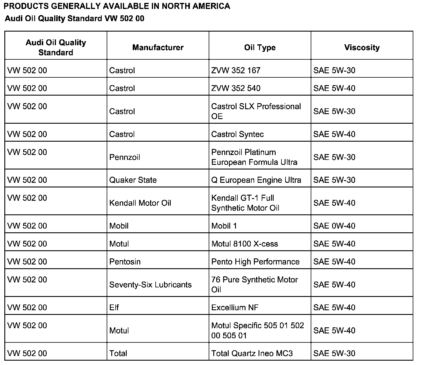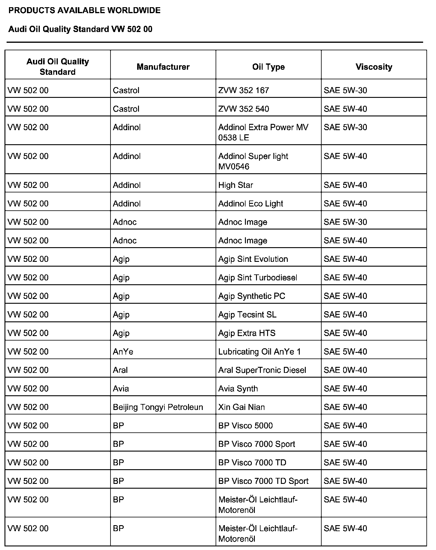 From model year 2005, all Audi engines must always use engine oil that expressly conforms to Audi Oil Quality Standard VW 502 00 (with viscosities of SAE 5W-40, 5W-30, 0W-40).