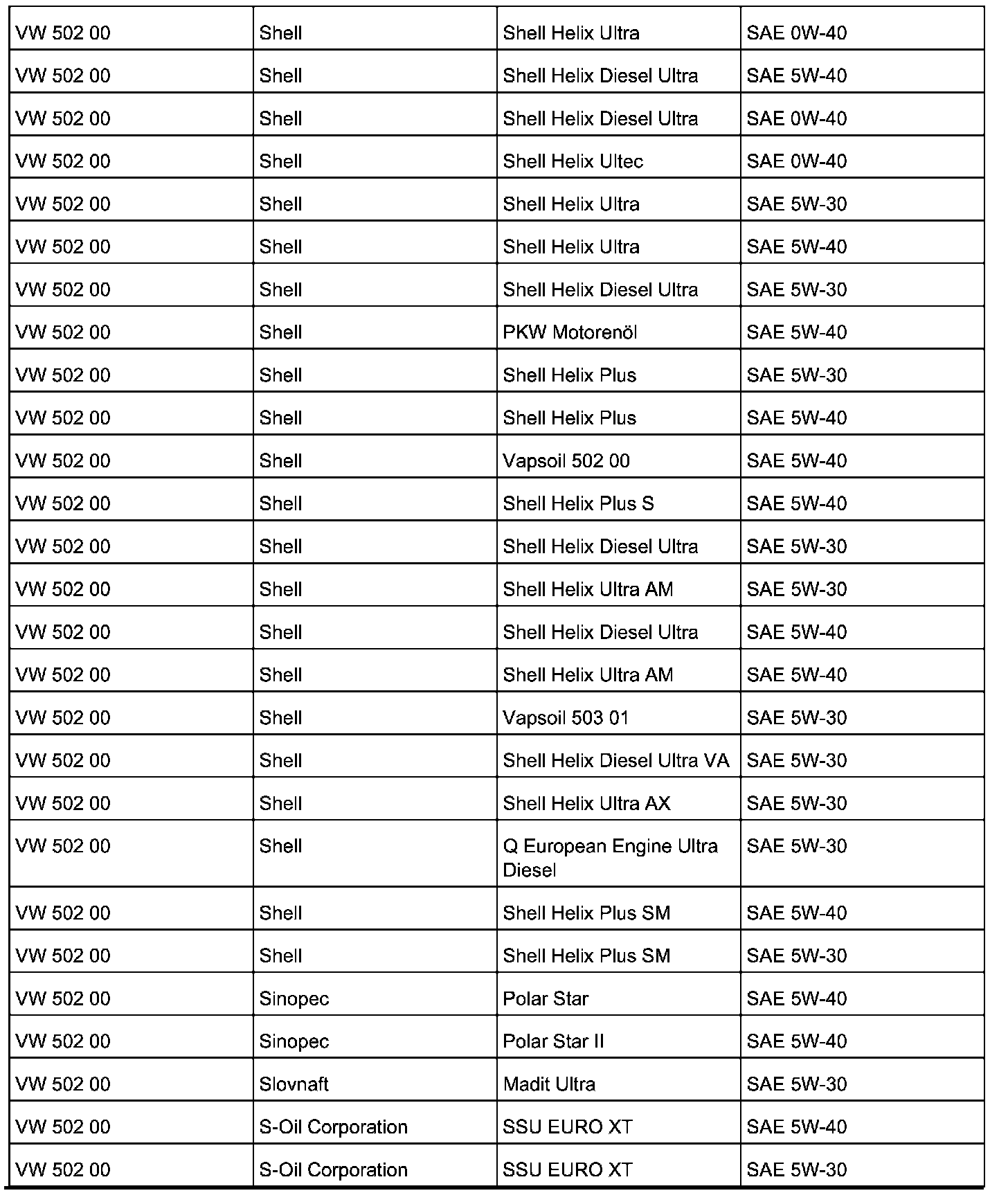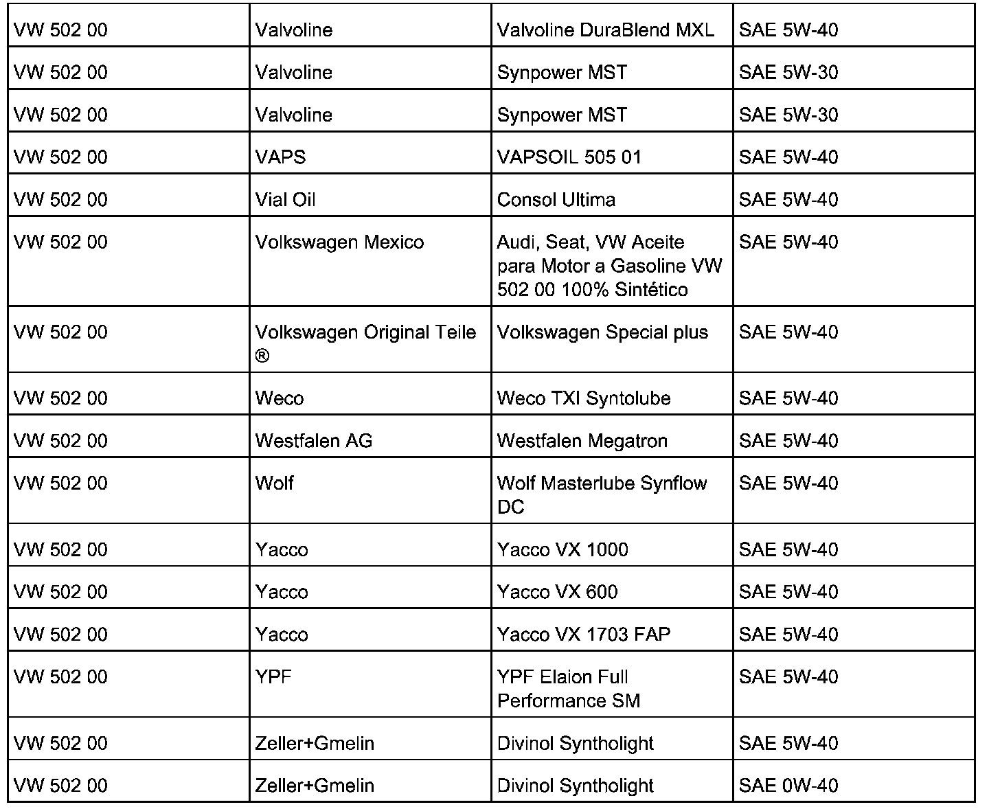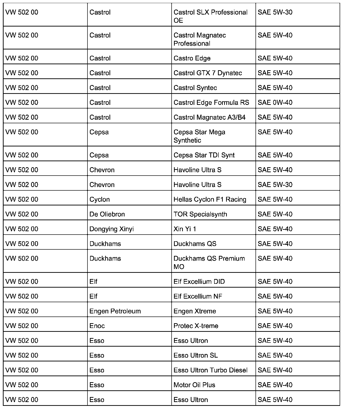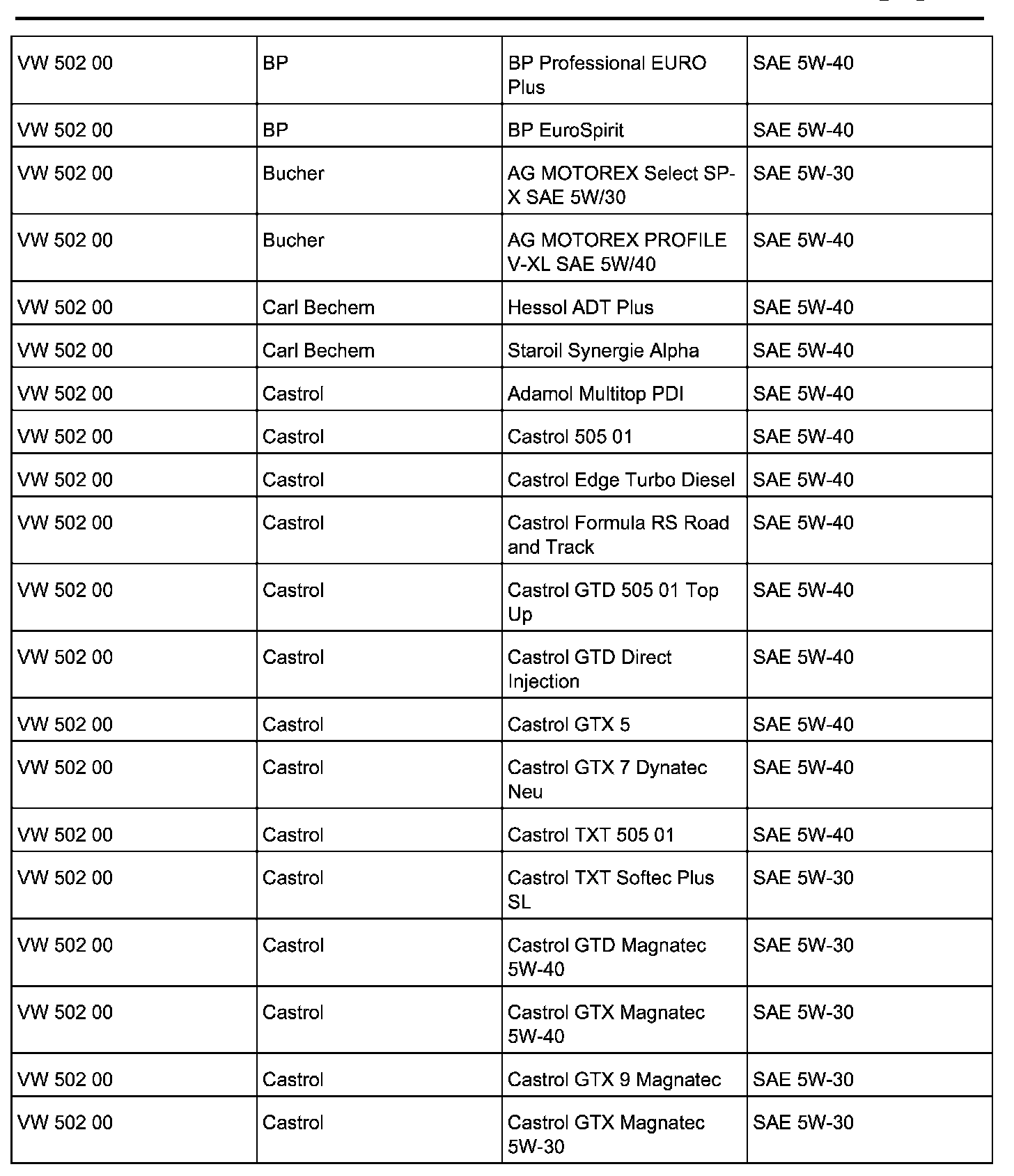 From model year 2005, all Audi engines must always use engine oil that expressly conforms to Audi Oil Quality Standard VW 502 00 (with viscosities of SAE 5W-40, 5W-30, 0W-40).