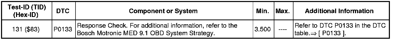 - If any of the components or systems fail to meet the specified values, refer to Diagnostic "Mode 03: Interrogating Fault Memory" to check for stored DTC's or the corresponding diagnostic repair procedure => [ Diagnostic Mode 03 - Read DTC Memory ] Diagnostic Mode 03 - Read DTC Memory.