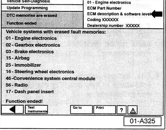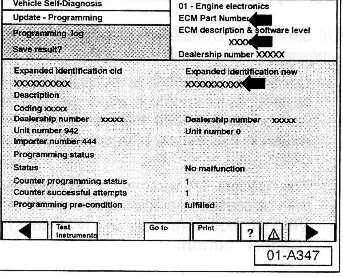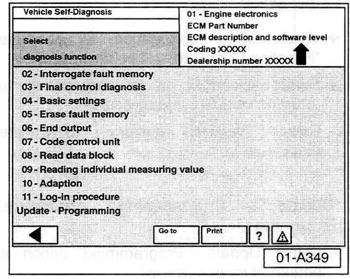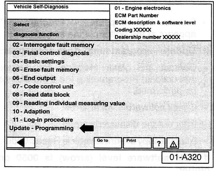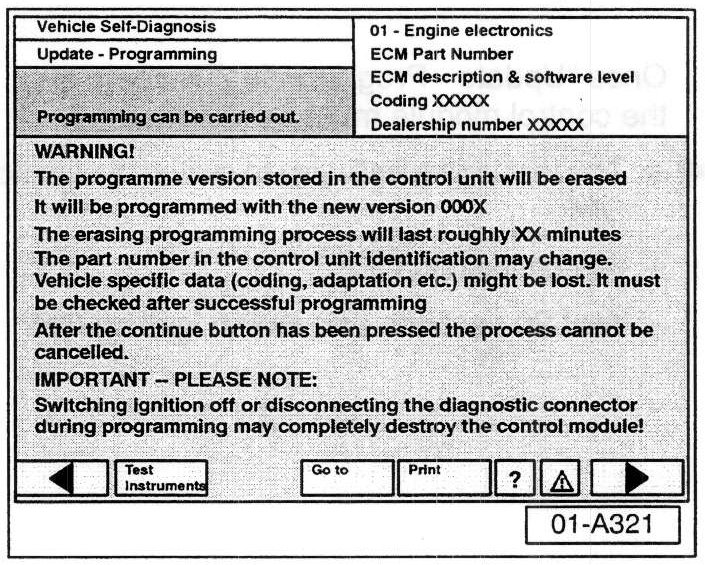 ^ If the "Update Programming" was interrupted and an error message appeared, or DTC 18089, P1681 is present in the ECM, the engine may not start. The "Update - Programming" procedure will need to be performed again. Please call the Audi Dealer Technician Helpline. The collection services step for DTC checking and clearing does not need to be repeated. Select "Update - Programming" on the Select Diagnosis Screen.